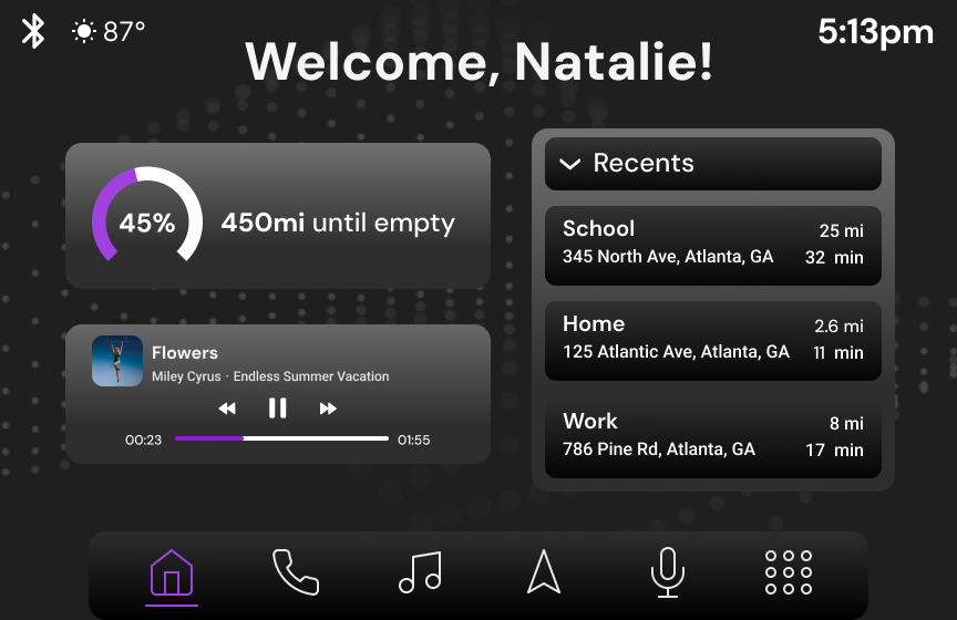 The design centers on clarity and comfort. Every screen, icon, and transition was created to help drivers feel confident and connected while reducing distractions. By combining intuitive layouts with thoughtful touches like voice assistance and personalized greetings, Praxis builds a stronger sense of trust between people and their cars.