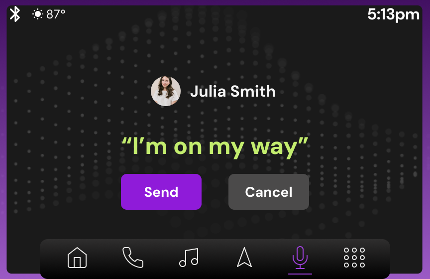 The Music and Messaging screens were designed for quick control through touch or voice. Clear text, simple icons, and smooth motion make the experience calm and distraction-free.